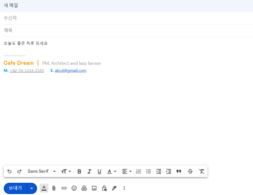 [편지쓰기]를 하면, 아래 그림처럼 서명이 자동으로 내용 하단에 포함이 됩니다.